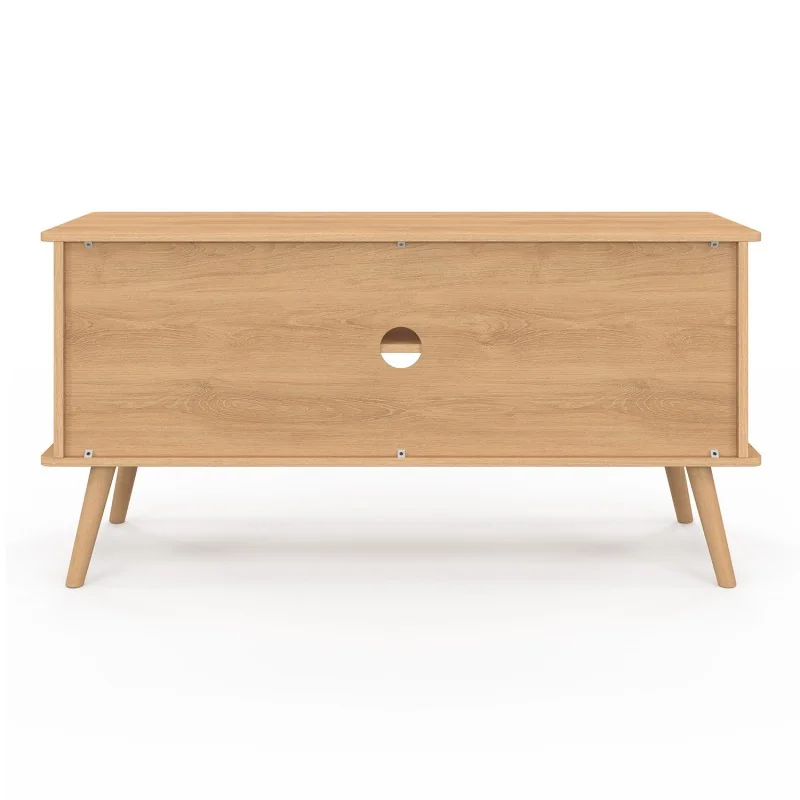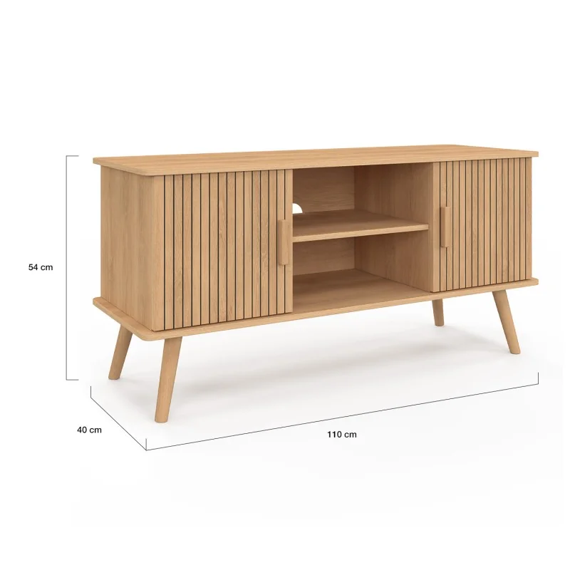 Ce joli Meuble TV apportera une touche tendance à votre intérieur. Ses façades de porte en effet lattes donneront du cachet à votre pièce tout en vous offrant un bel espace de rangement !