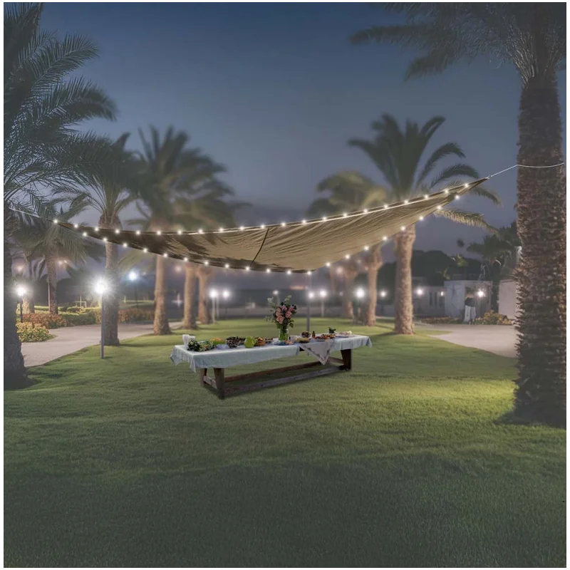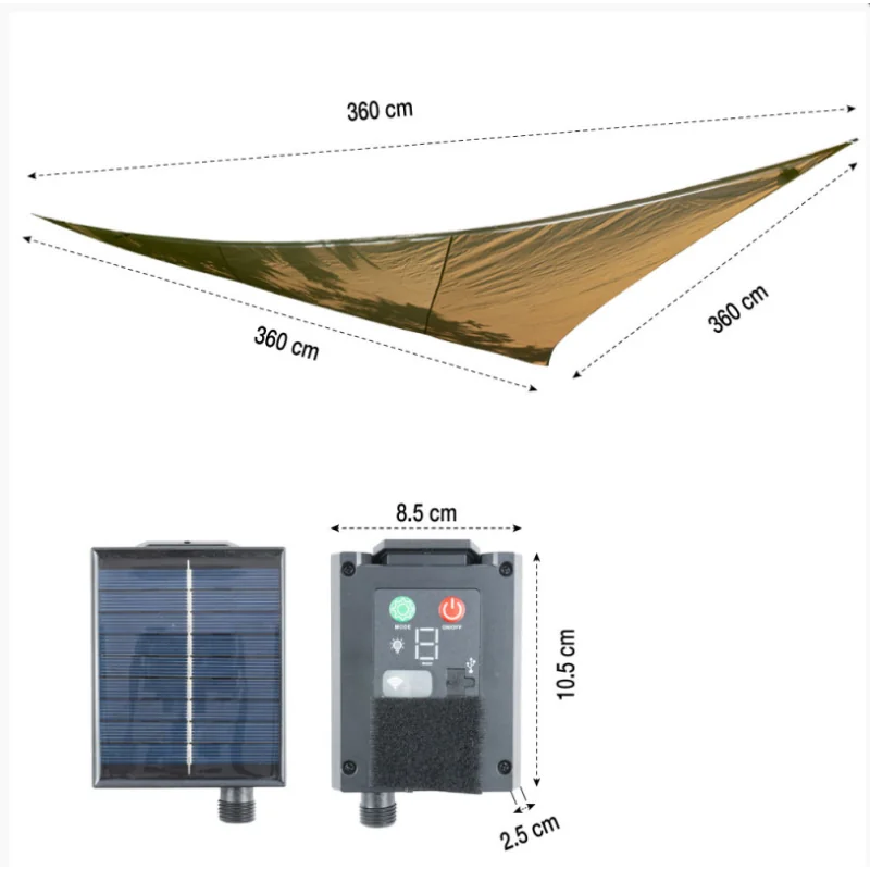 Voile d'omrage lumineux solaire - Polyester 160gr/m², batterie: 600mAh. Autonomie: 12h avec un temps de charge de 6h. Panneau solaire: 3.7V 300 mA. Led blanc chaud. 110 Led.